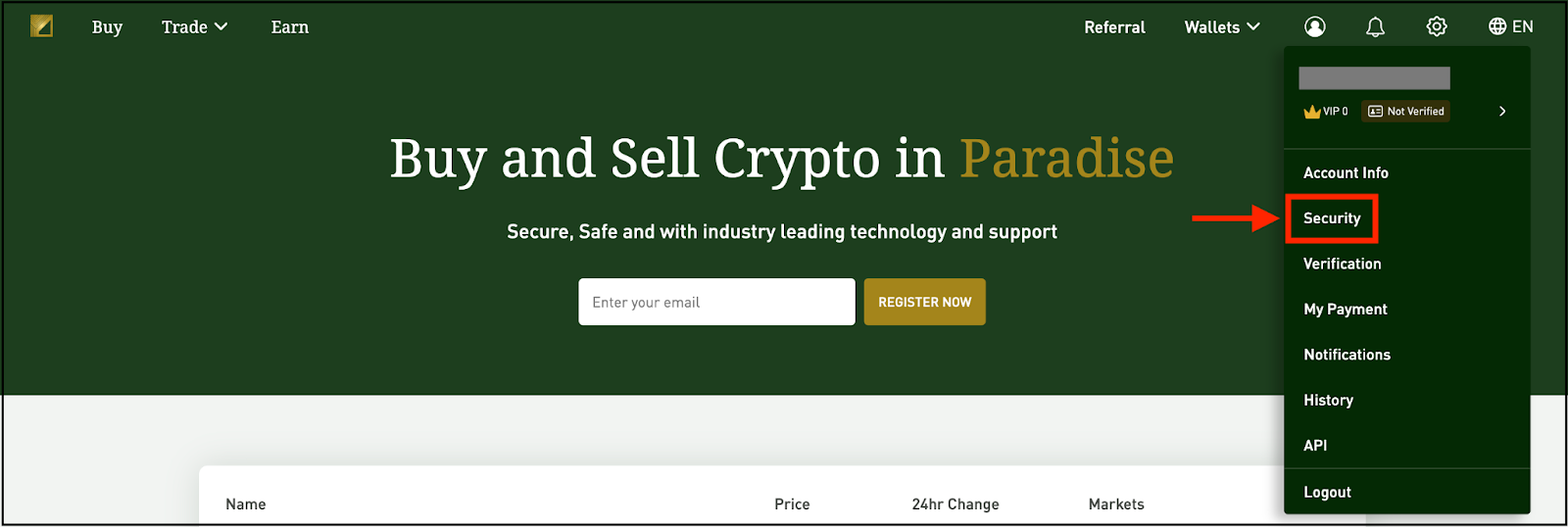 1. After logging in, click the Profile icon and select "Security" as shown in the image below.
